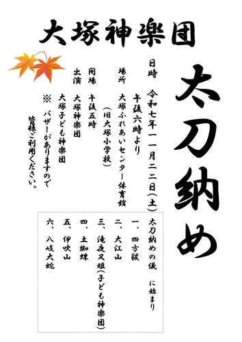 《プログラム》 1.神降しー山王神楽団 2.筑波山ー横田神楽団 3.鐘馗ー津浪神楽団 4.鈴鹿ー山王神楽団 5.瀧夜叉姫ー中川戸神楽団 6.羅生門ー東山神楽団 7.塵倫ー筏津神楽団 8.桜井の駅−原田神楽団 9.田村丸ー宮乃木神楽団 10.大江山ー大塚神楽団 11.紅葉狩ー上河内神楽団 12.土蜘蛛ー琴庄神楽団 13.大蛇ー石見神楽亀山社中