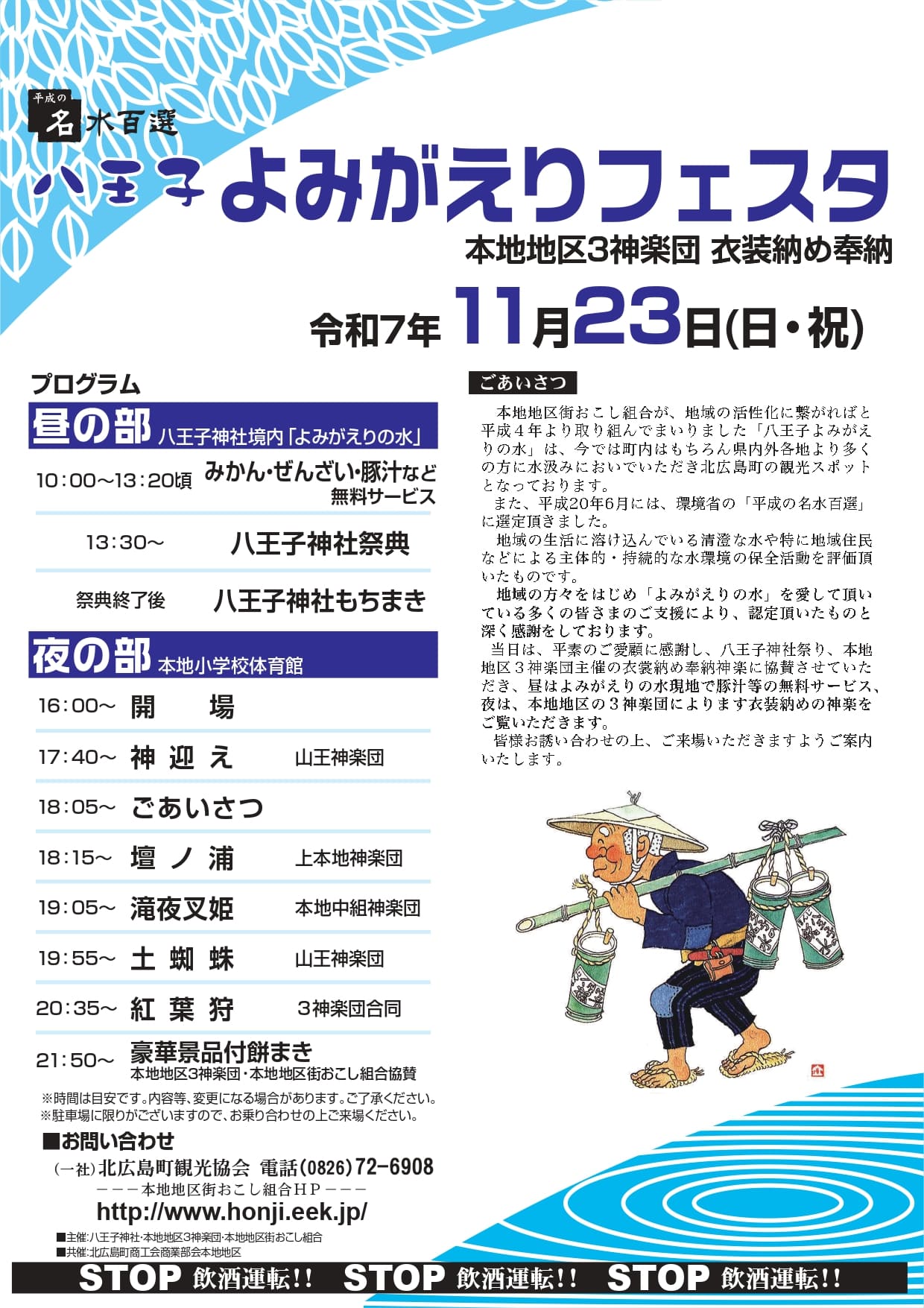 ■指定席/S席28,000円(約畳2畳半・6名分) A席26,000円(約畳2畳半・6名分) B個人席(畳)4,500円、C個人席(椅子)4,500円 カメラ席5,000円 [指定席券販売] 2025年10月12日(日)午前8時30分から道の駅舞ロードIC千代田(観光案内所となり会場)にて販売開始! 12日午前10時以降は(一社)北広島町観光協会(道の駅舞ロードIC千代田内観光案内所)にて販売します。 ※指定席の取扱いは、(一社)北広島町観光協会のみです。 S席とA席はお1人様1席販売、B席C席は4席まで販売します。 ■自由席/大人(前売)3,000円(当日)3,500円、中学生以下自由席は無料(指定席は有料) [前売券自由席販売所](一社)北広島町観光協会、ひろしま夢ぷらざ、千代田ショッピングセンターサンクス、サングリーン三次、コムズ安佐パーク ※前売券は、指定席・自由席ともに(一社)北広島町観光協会で電話予約可能です。