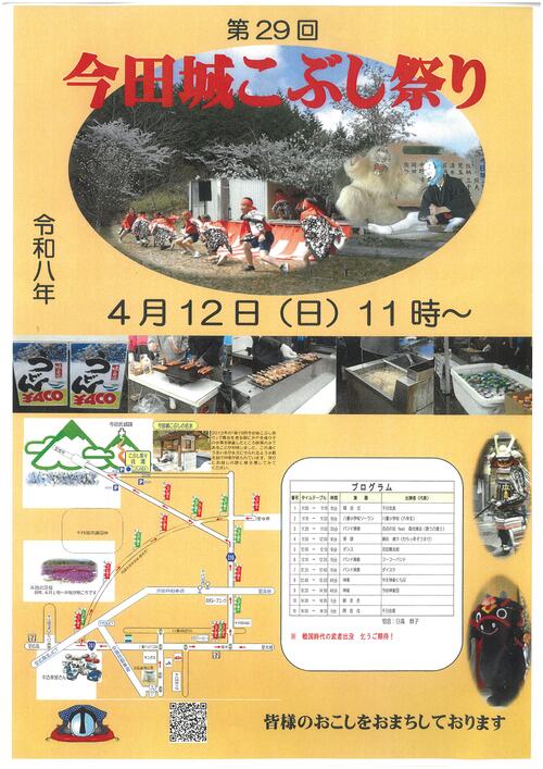 【日時】 令和8年4月12日(日) 11時〜 【場所】 今田氏城館跡周辺 【プログラム】 1. 11:00〜11:10 開会式 千日会長 2. 11:10〜11:20 八重小学校ソーラン 八重小学校六年生 3. 11:20〜11:50 バンド演奏 百合の会 feat 森光雅志(歌う介護士) 4. 11:50〜12:00 落語 藤田湊介(わらっ亭そうすけ) 5. 12:00〜12:10 ダンス 花田舞太郎 6. 12:10〜12:25 バンド演奏 フ−フ−バンド 7. 12:25〜12:40 バンド演奏 ダイスケ 8. 12:40〜13:20 神楽 やえ神楽くらぶ 9. 13:20〜14:00 神楽 今田神楽団 10. 14:00〜14:05 餅まき 11. 14:05〜14:10 閉会式 千日会長 〈司会:日高恭子〉 |